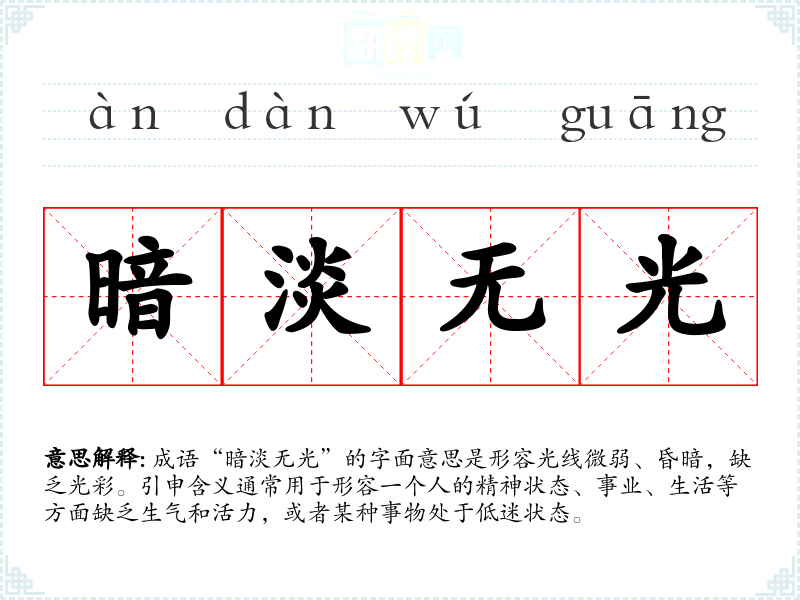 成语“暗淡无光”的字面意思是形容光线微弱、昏暗,缺乏光彩。引申含义通常用于形容一个人的精神状态、事业、生活等方面缺乏生气和活力,或者某种事物处于低迷状态。