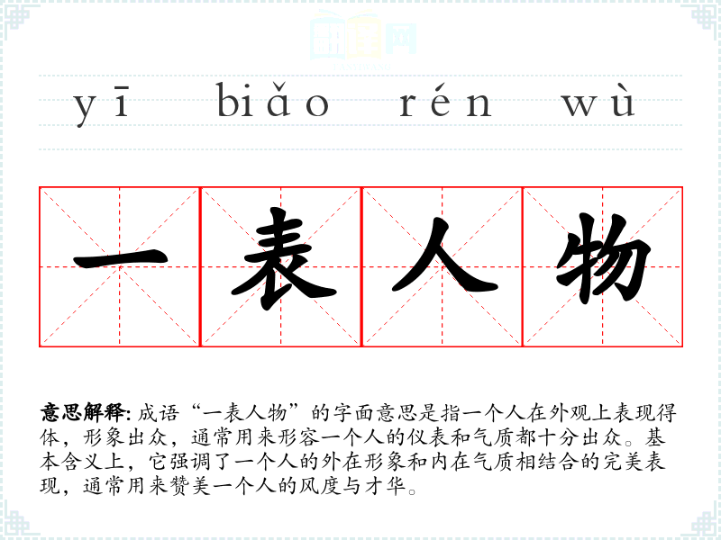 成语“一表人物”的字面意思是指一个人在外观上表现得体,形象出众,通常用来形容一个人的仪表和气质都十分出众。基本含义上,它强调了一个人的外在形象和内在气质相结合的完美表现,通常用来赞美一个人的风度与才华。