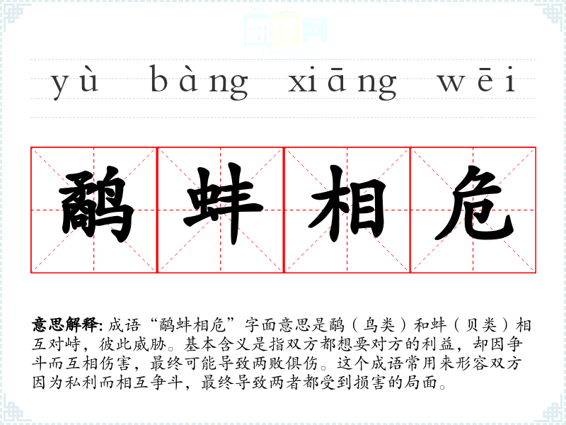 成语“鹬蚌相危”字面意思是鹬(鸟类)和蚌(贝类)相互对峙,彼此威胁。基本含义是指双方都想要对方的利益,却因争斗而互相伤害,最终可能导致两败俱伤。这个成语常用来形容双方因为私利而相互争斗,最终导致两者都受到损害的局面。
