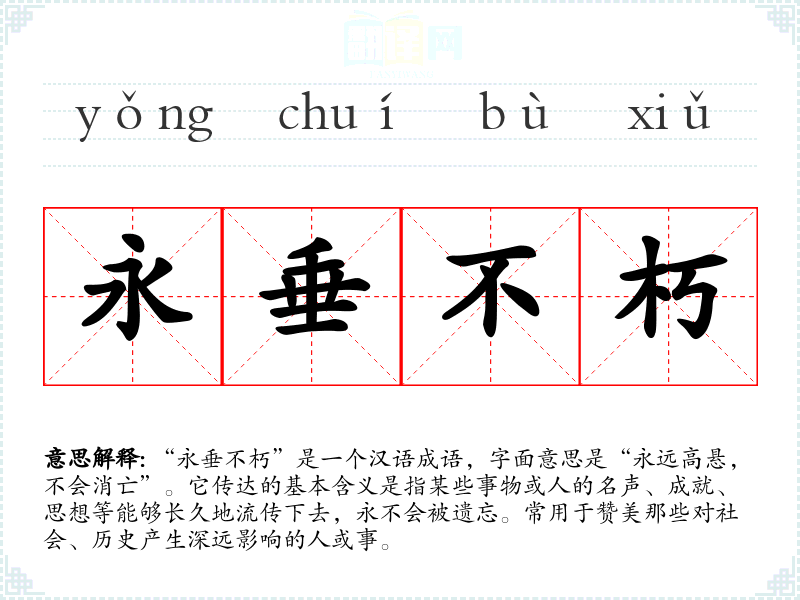 | 永垂不朽 | 垂:留传后世;朽:腐烂,磨灭。指光辉的事迹和伟大的精神永远流传,不会磨灭。 |