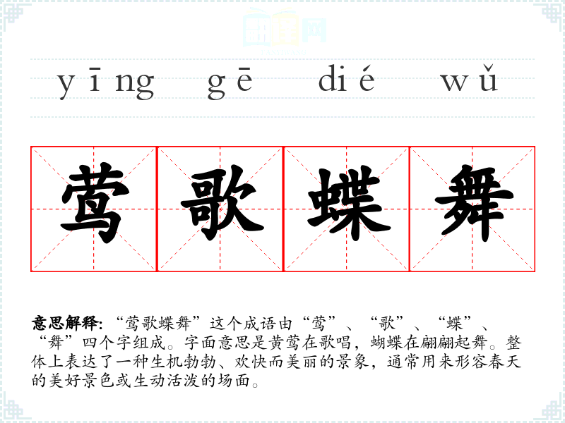 “莺歌蝶舞”这个成语由“莺”、“歌”、“蝶”、“舞”四个字组成。字面意思是黄莺在歌唱,蝴蝶在翩翩起舞。整体上表达了一种生机勃勃、欢快而美丽的景象,通常用来形容春天的美好景色或生动活泼的场面。