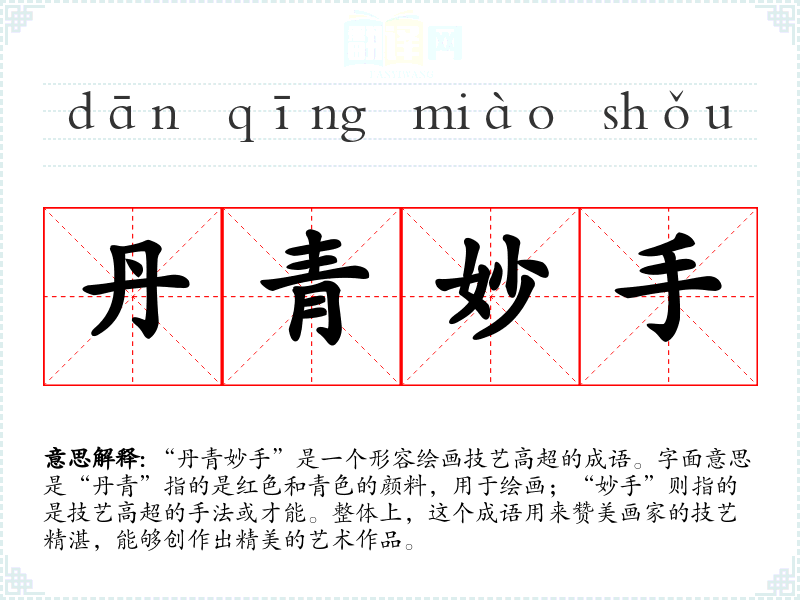 “丹青妙手”是一个形容绘画技艺高超的成语。字面意思是“丹青”指的是红色和青色的颜料,用于绘画;“妙手”则指的是技艺高超的手法或才能。整体上,这个成语用来赞美画家的技艺精湛,能够创作出精美的艺术作品。