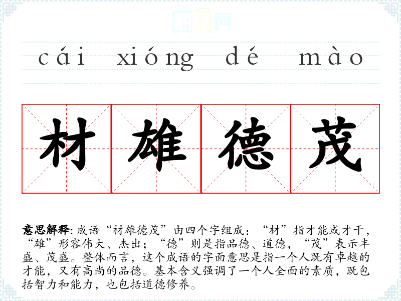 成语“材雄德茂”由四个字组成:“材”指才能或才干,“雄”形容伟大、杰出;“德”则是指品德、道德,“茂”表示丰盛、茂盛。整体而言,这个成语的字面意思是指一个人既有卓越的才能,又有高尚的品德。基本含义强调了一个人全面的素质,既包括智力和能力,也包括道德修养。