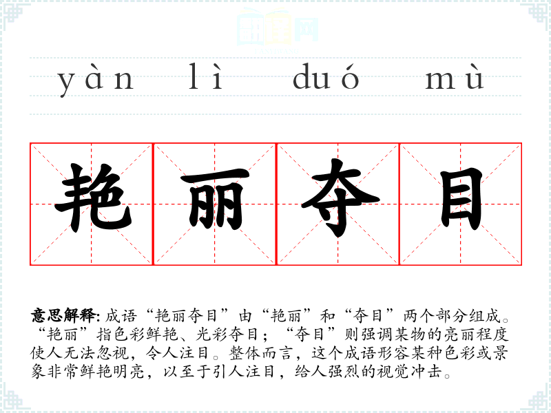 成语“艳丽夺目”由“艳丽”和“夺目”两个部分组成。“艳丽”指色彩鲜艳、光彩夺目;“夺目”则强调某物的亮丽程度使人无法忽视,令人注目。整体而言,这个成语形容某种色彩或景象非常鲜艳明亮,以至于引人注目,给人强烈的视觉冲击。
