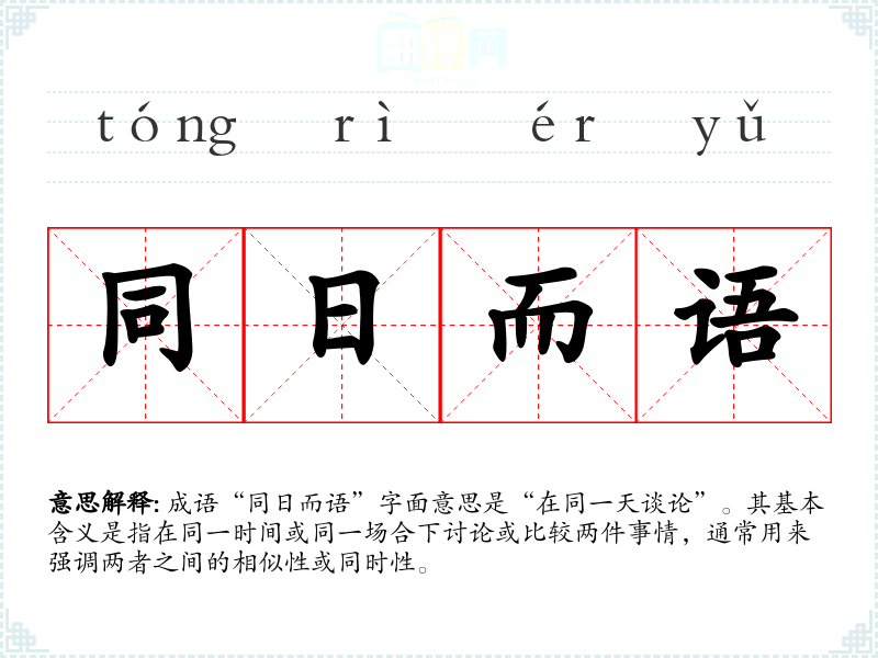 成语“同日而语”字面意思是“在同一天谈论”。其基本含义是指在同一时间或同一场合下讨论或比较两件事情,通常用来强调两者之间的相似性或同时性。