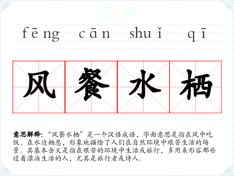 “风餐水栖”是一个汉语成语,字面意思是指在风中吃饭、在水边栖息,形象地描绘了人们在自然环境中艰苦生活的场景。其基本含义是指在艰苦的环境中生活或旅行,多用来形容那些过着漂泊生活的人,尤其是旅行者或诗人。