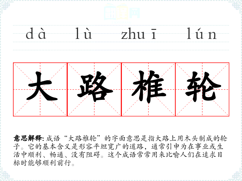 成语“大路椎轮”的字面意思是指大路上用木头制成的**。它的基本含义是形容平坦宽广的道路,通常引申为在事业或生活中顺利、畅通、没有阻碍。这个成语常常用来比喻人们在追求目标时能够顺利前行。