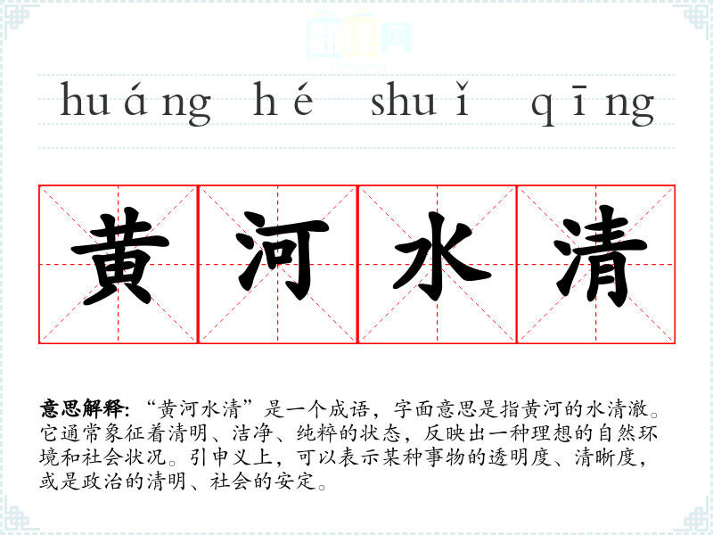 “黄河水清”是一个成语,字面意思是指黄河的水清澈。它通常象征着清明、洁净、纯粹的状态,反映出一种理想的自然环境和社会状况。引申义上,可以表示某种事物的透明度、清晰度,或是政治的清明、社会的安定。