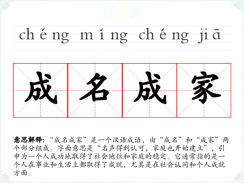 “成名成家”是一个汉语成语,由“成名”和“成家”两个部分组成。字面意思是“名声得到认可,家庭也开始建立”,引申为一个人成功地取得了社会地位和家庭的稳定。它通常指的是一个人在事业和生活上都取得了成就,尤其是在社会认同和个人成就方面。