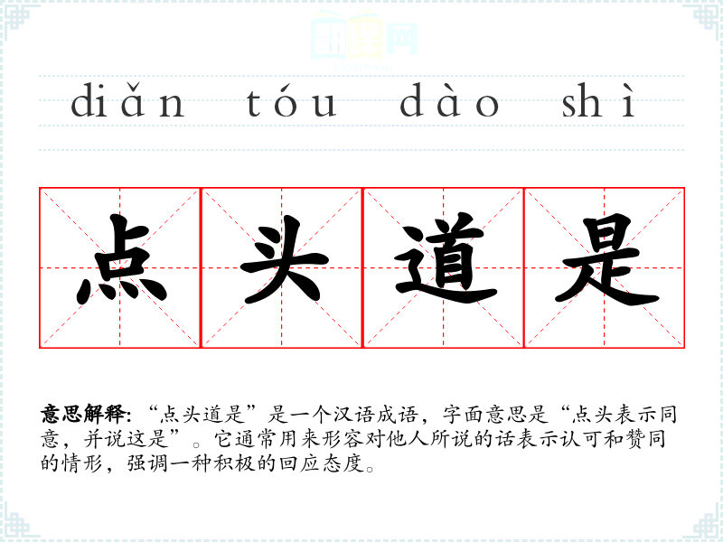 “点头道是”是一个汉语成语,字面意思是“点头表示同意,并说这是”。它通常用来形容对他人所说的话表示认可和赞同的情形,强调一种积极的回应态度。