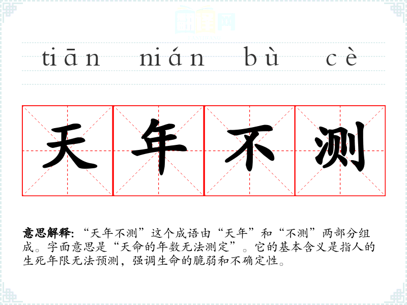 “天年不测”这个成语由“天年”和“不测”两部分组成。字面意思是“天命的年数无法测定”。它的基本含义是指人的生死年限无法预测,强调生命的脆弱和不确定性。