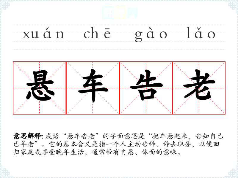 成语“悬车告老”的字面意思是“把车悬起来,告知自己已年老”。它的基本含义是指一个人主动告辞、辞去职务,以便回归家庭或享受晚年生活,通常带有自愿、体面的意味。