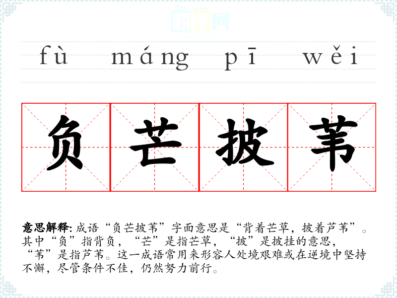 成语“负芒披苇”字面意思是“背着芒草,披着芦苇”。其中“负”指背负,“芒”是指芒草,“披”是披挂的意思,“苇”是指芦苇。这一成语常用来形容人处境艰难或在逆境中坚持不懈,尽管条件不佳,仍然努力前行。