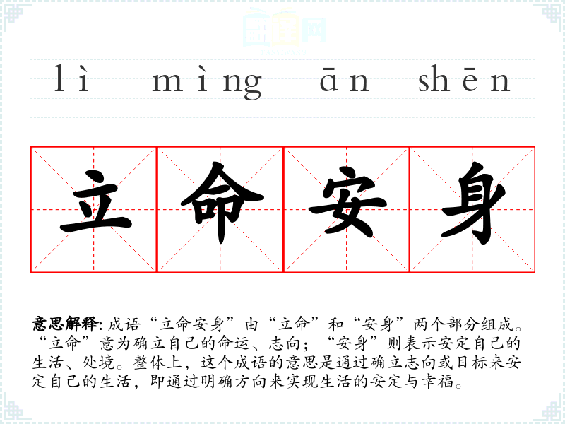 成语“立命安身”由“立命”和“安身”两个部分组成。“立命”意为确立自己的命运、志向;“安身”则表示安定自己的生活、处境。整体上,这个成语的意思是通过确立志向或目标来安定自己的生活,即通过明确方向来实现生活的安定与幸福。