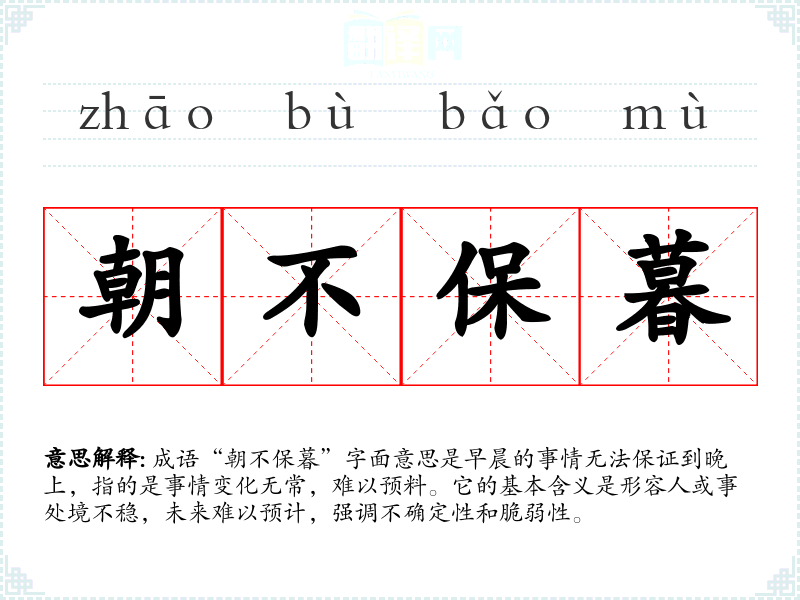 成语“朝不保暮”字面意思是早晨的事情无法保证到晚上,指的是事情变化无常,难以预料。它的基本含义是形容人或事处境不稳,未来难以预计,强调不确定性和脆弱性。
