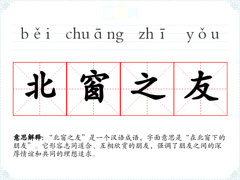 “北窗之友”是一个汉语成语,字面意思是“在北窗下的朋友”。它形容志同道合、互相欣赏的朋友,强调了朋友之间的深厚情谊和共同的理想追求。