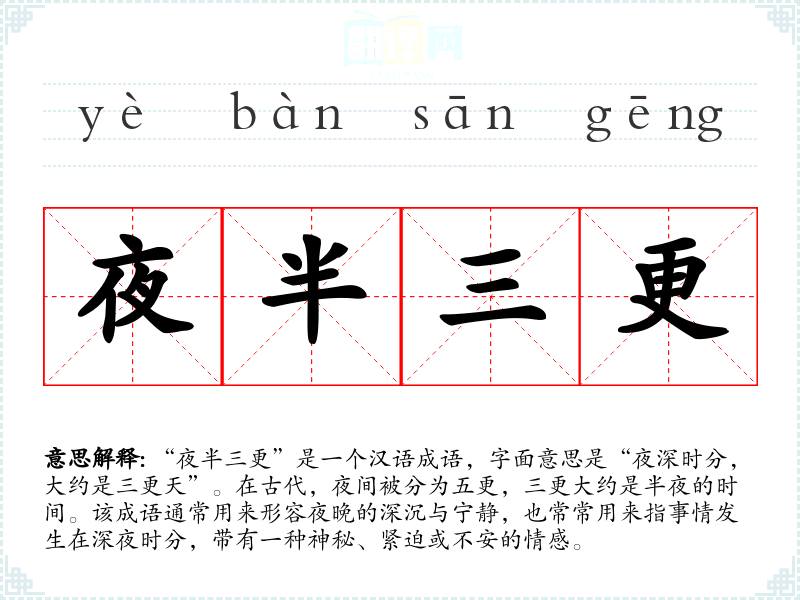 “夜半三更”的来源可以追溯到古代的时间划分。古人将一夜分为五个时间段,每个时间段称为“更”。“三更”则是指晚上11点到1点这个时间段,正是深夜中最为寂静、黑暗的时刻。成语的使用在古典文学中较为常见,尤其是在一些描写夜晚情景或神秘的作品中。