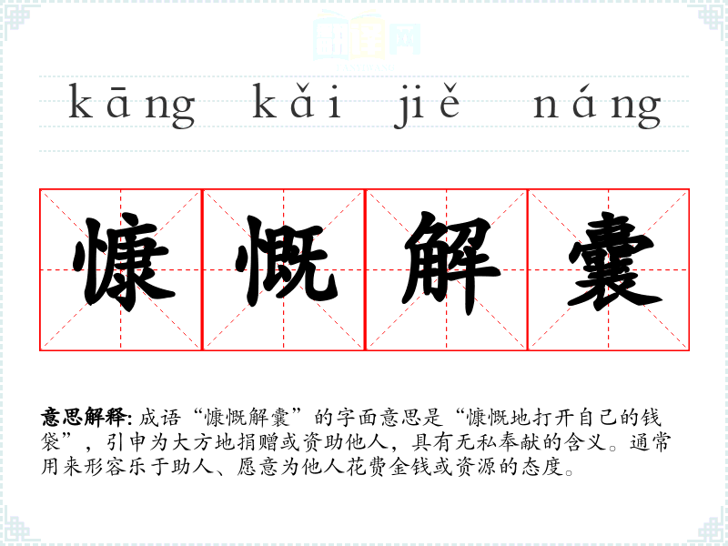 成语“慷慨解囊”的字面意思是“慷慨地打开自己的钱袋”,引申为大方地捐赠或资助他人,具有无私奉献的含义。通常用来形容乐于助人、愿意为他人花费金钱或资源的态度。