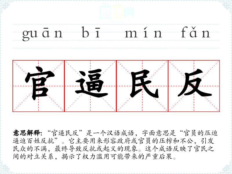 “官逼民反”是一个汉语成语,字面意思是“官员的压迫逼迫百姓反抗”。它主要用来形容政府或官员的压榨和不公,引发民众的不满,最终导致反抗或起义的现象。这个成语反映了官民之间的对立关系,揭示了权力滥用可能带来的严重后果。