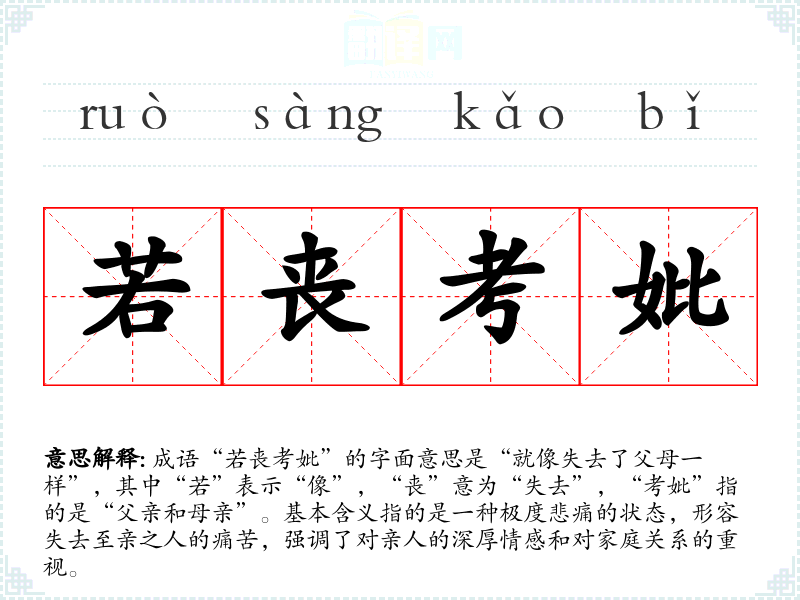 “若丧考妣”出自《礼记·丧服》中,古代对于丧事有严格的礼仪规定,失去父母的人通常会表现出极大的悲痛和哀悼。该成语反映了古代**社会对家庭关系的重视以及对亲情的深刻理解,体现了儒家文化中对父母的尊重和孝道的强调。