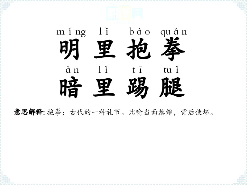 抱拳:古代的一种礼节。比喻当面恭维,背后使坏。 |