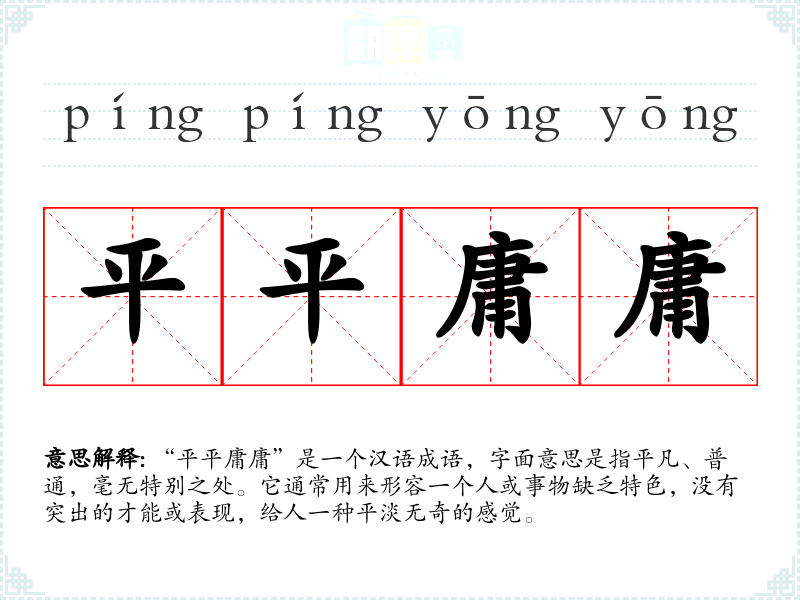 “平平庸庸”是一个汉语成语,字面意思是指平凡、普通,毫无特别之处。它通常用来形容一个人或事物缺乏特色,没有突出的才能或表现,给人一种平淡无奇的感觉。