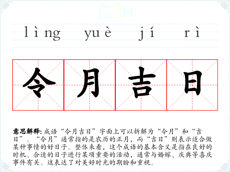 成语“令月吉日”字面上可以拆解为“令月”和“吉日”。“令月”通常指的是农历的正月,而“吉日”则表示适合做某种事情的好日子。整体来看,这个成语的基本含义是指在良好的时机、合适的日子进行某项重要的活动,通常与婚嫁、庆典等喜庆**有关。这表达了对美好时光的期盼和重视。