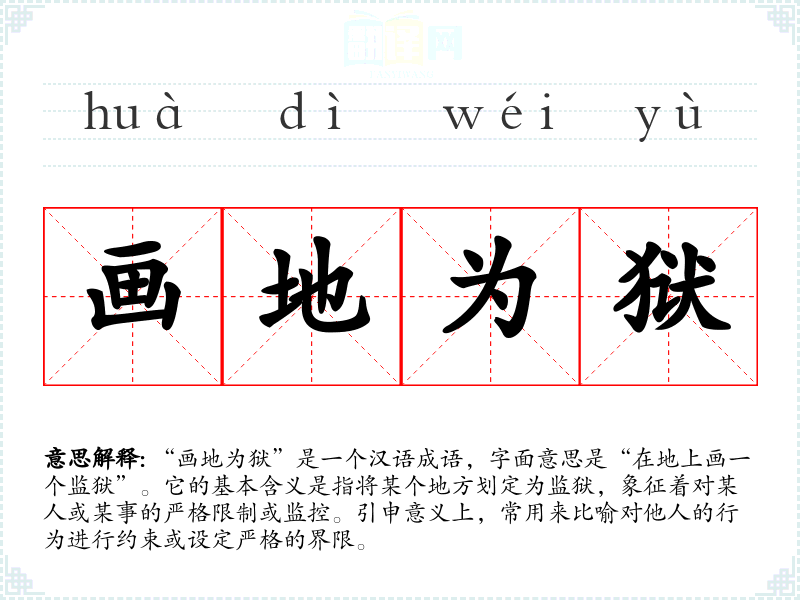 “画地为狱”是一个汉语成语,字面意思是“在地上画一个监狱”。它的基本含义是指将某个地方划定为监狱,象征着对某人或某事的严格限制或监控。引申意义上,常用来比喻对他人的行为进行约束或设定严格的界限。