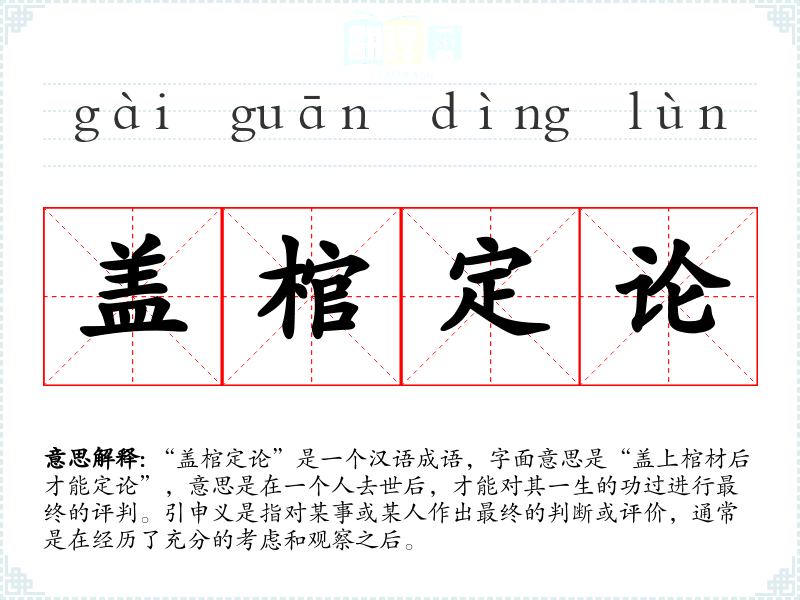 | 盖棺定论 | 盖上棺材盖,才能下结论。指人死后对其一生作出评价。 |