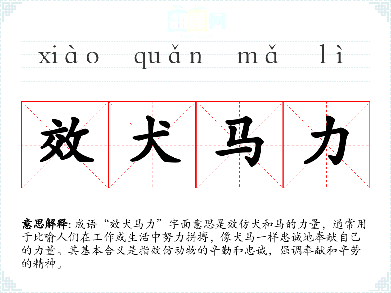 “效犬马力”源自古代对犬与马的观察与评价。犬和马在古代社会中被视为重要的劳动工具和忠诚的伙伴,常常为主人辛勤工作。该成语可能没有明确的文学出处,但其意象在古代文献中多有体现,反映了人们对劳动与忠诚的重视。