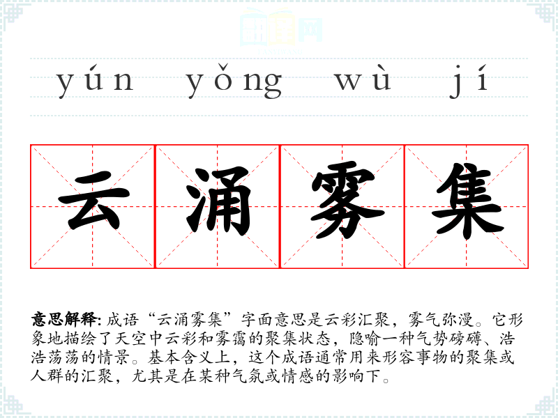 - 日常对话:在描述人群聚集或某种情绪的高涨时,可以说“会议上,大家云涌雾集,讨论异常热烈。”