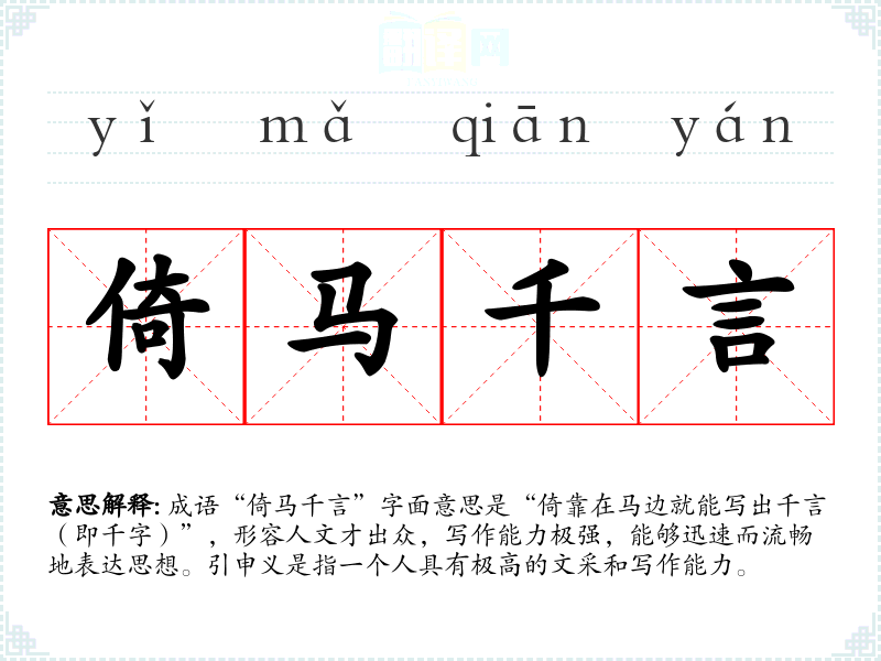 成语“倚马千言”字面意思是“倚靠在马边就能写出千言(即千字)”,形容人文才出众,写作能力极强,能够迅速而流畅地表达思想。引申义是指一个人具有极高的文采和写作能力。