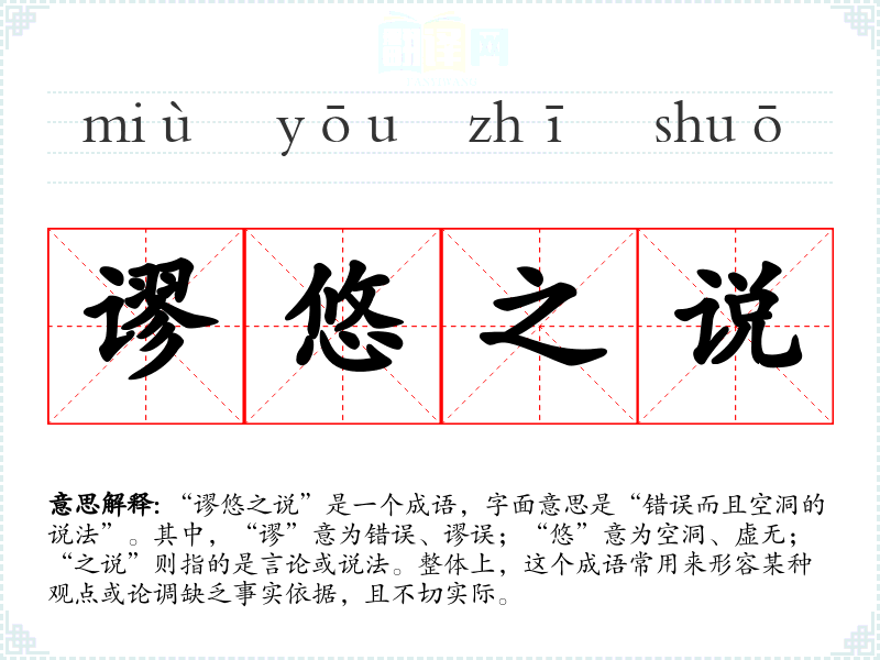 | 谬悠之说 | 谬悠:荒诞,无稽。荒唐、不合情理的言论。 |