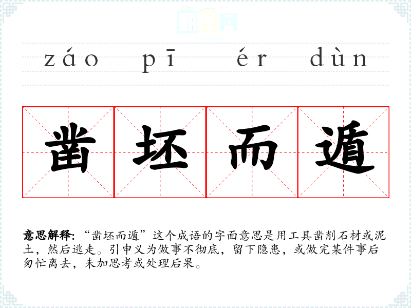“凿坯而遁”这个成语的字面意思是用工具凿削石材或泥土,然后逃走。引申义为做事不彻底,留下隐患,或做完某件事后匆忙离去,未加思考或处理后果。
