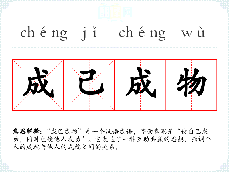 “成己成物”是一个汉语成语,字面意思是“使自己成功,同时也使他人成功”。它表达了一种互助共赢的思想,强调个人的成就与他人的成就之间的关系。