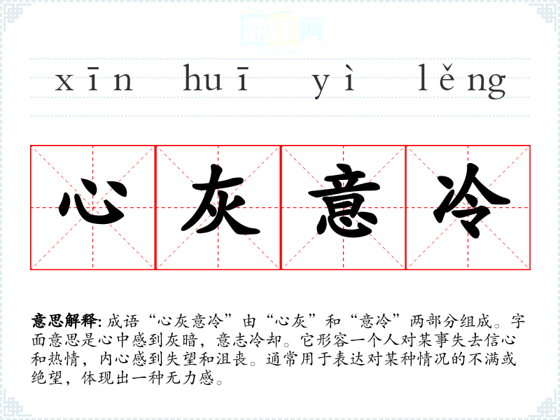 - 同义成语:失望透顶、心如死灰、丧气失望。它们都表达了对事物失去信心的感受,但“心灰意冷”更强调内心的冷漠与无奈。