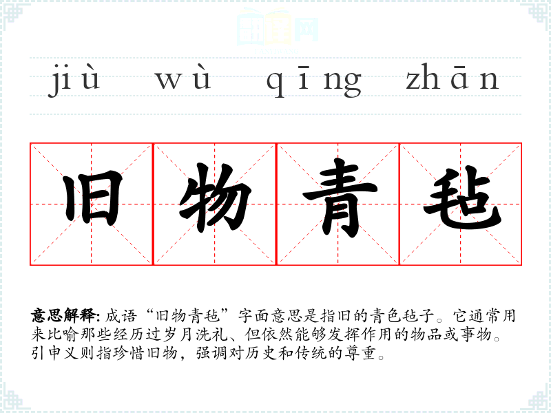 成语“旧物青毡”字面意思是指旧的青色毡子。它通常用来比喻那些经历过岁月洗礼、但依然能够发挥作用的物品或事物。引申义则指珍惜旧物,强调对历史和传统的尊重。