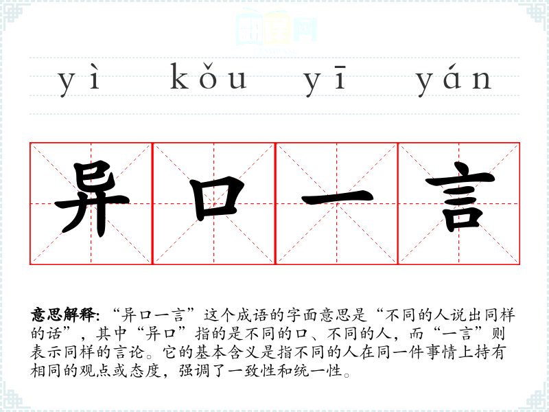 “异口一言”这个成语的字面意思是“不同的人说出同样的话”,其中“异口”指的是不同的口、不同的人,而“一言”则表示同样的言论。它的基本含义是指不同的人在同一件事情上持有相同的观点或态度,强调了一致性和统一性。