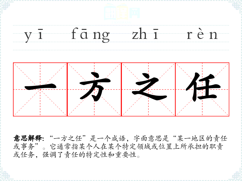 通过对“一方之任”的学,我更加理解了责任的深刻意义。在语言学和表达中,能够准确使用这样的成语可以增强我的表达效果,更好地传递我的思想和情感。