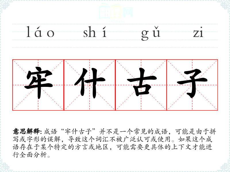 成语“牢什古子”并不是一个常见的成语,可能是由于拼写或字形的误解,导致这个词汇不被广泛认可或使用。如果这个成语存在于某个特定的方言或地区,可能需要更具体的上下文才能进行全面分析。