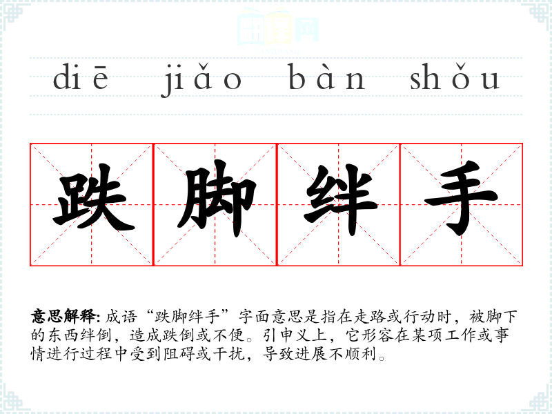 成语“跌脚绊手”字面意思是指在走路或行动时,被脚下的东西绊倒,造成跌倒或不便。引申义上,它形容在某项工作或事情进行过程中受到阻碍或干扰,导致进展不顺利。
