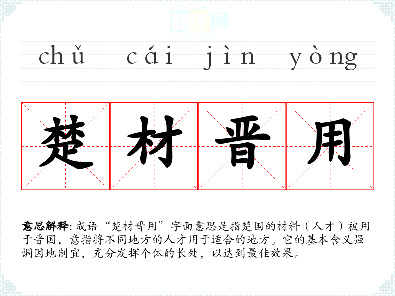 成语“楚材晋用”字面意思是指楚国的材料(人才)被用于晋国,意指将不同地方的人才用于适合的地方。它的基本含义强调因地制宜,充分发挥个体的长处,以达到最佳效果。