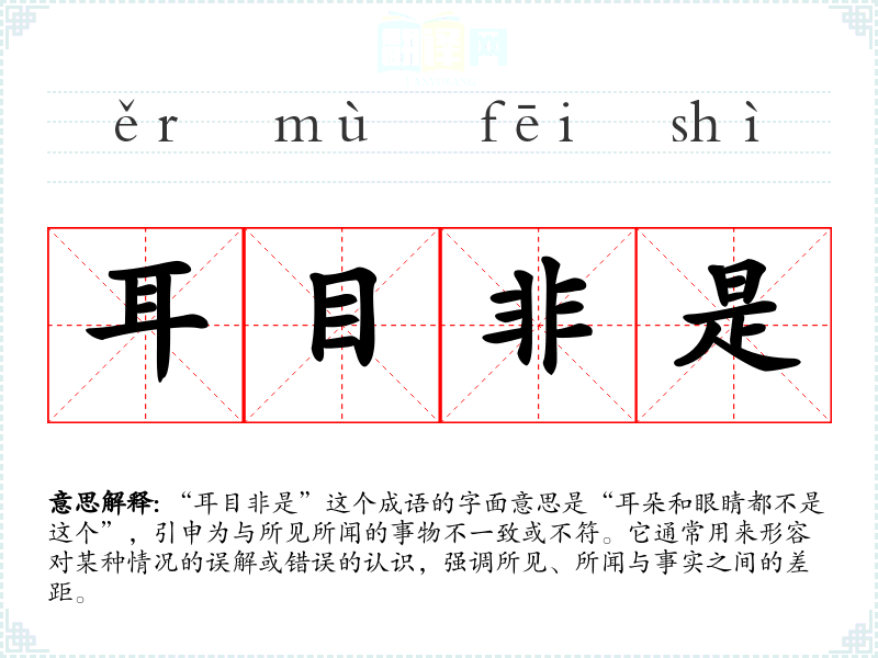 “耳目非是”这个成语的字面意思是“耳朵和眼睛都不是这个”,引申为与所见所闻的事物不一致或不符。它通常用来形容对某种情况的误解或错误的认识,强调所见、所闻与事实之间的差距。