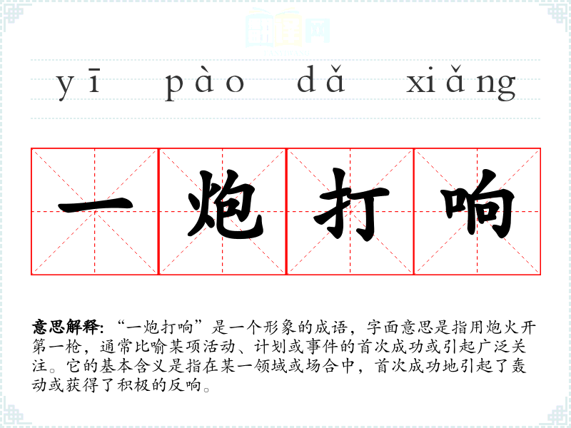 “一炮打响”源于军事术语,描述的是炮火开战的瞬间。历史上,炮火的响声往往标志着战斗的开始或重大**的发生。因此,该成语暗含了激烈、迅速和震撼的意味。虽然具体的历史文献并不明确,但这种表达方式在战争和军事文学中常见,后来逐渐被引申到更广泛的社会和文化领域。