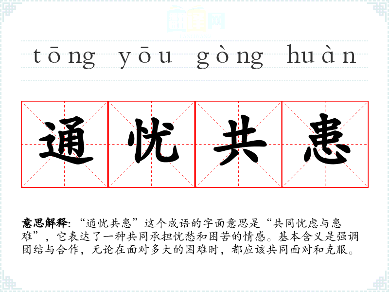 这个成语的具体出处并不明确,但其意思可以追溯到**传统文化中重视集体主义和团结合作的思想。古代文人常常在诗词或散文中提到同舟共济、共克时艰等思想,与“通忧共患”有相似的内涵。