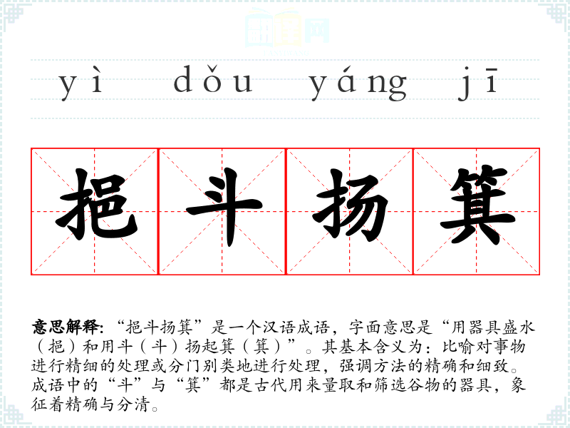 “挹斗扬箕”是一个汉语成语,字面意思是“用器具盛水(挹)和用斗(斗)扬起箕(箕)”。其基本含义为:比喻对事物进行精细的处理或分门别类地进行处理,强调方法的精确和细致。成语中的“斗”与“箕”都是古代用来量取和筛选谷物的器具,象征着精确与分清。