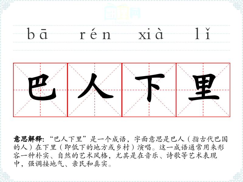 “巴人下里”是一个成语,字面意思是巴人(指古代巴国的人)在下里(即低下的地方或乡村)演唱。这一成语通常用来形容一种朴实、自然的艺术风格,尤其是在音乐、诗歌等艺术表现中,强调接地气、亲民和真实。
