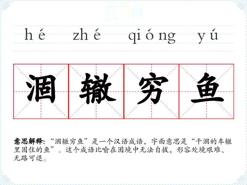 “涸辙穷鱼”是一个汉语成语,字面意思是“干涸的车辙里困住的鱼”。这个成语比喻在困境中无法自拔,形容处境艰难、无路可退。