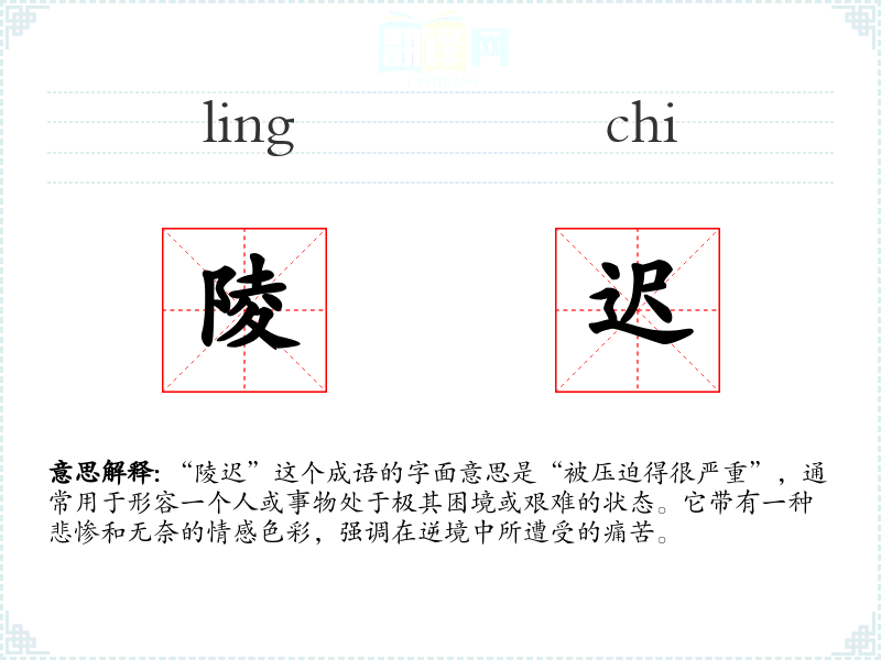 “陵迟”这个成语的字面意思是“被压迫得很严重”,通常用于形容一个人或事物处于极其困境或艰难的状态。它带有一种悲惨和无奈的情感色彩,强调在逆境中所遭受的痛苦。
