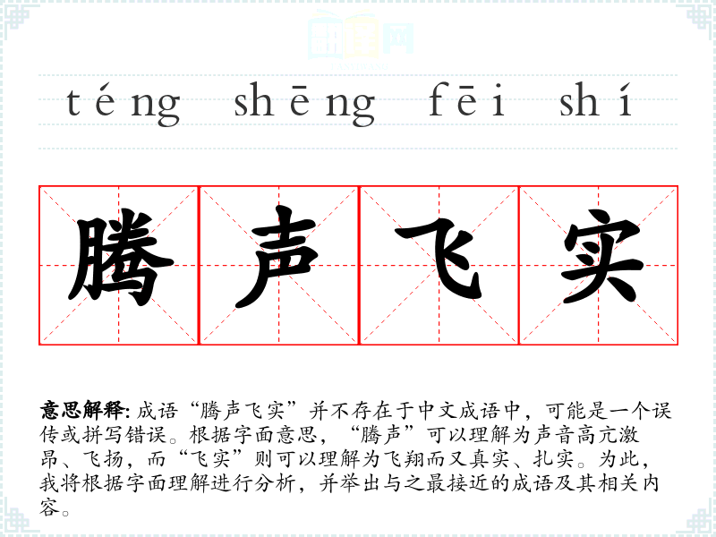 成语“腾声飞实”并不存在于中文成语中,可能是一个误传或拼写错误。根据字面意思,“腾声”可以理解为声音高亢激昂、飞扬,而“飞实”则可以理解为飞翔而又真实、扎实。为此,我将根据字面理解进行分析,并举出与之最接近的成语及其相关内容。